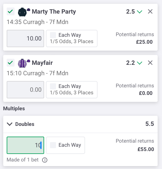 Above is a double bet from the Curragh. Marty The Party and Mayfair both need to win their races for you to win the double!