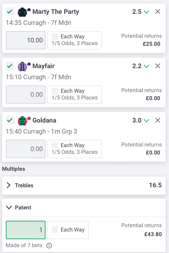 A patent bet, meanwhile, is bigger than a trixie and consists of three singles, three doubles and a treble: